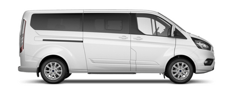 Die 9-Sitzer-Version des Transit Custom bietet mit breiten Sitzen, einer separaten Klimaanlage für die hinteren Passagiere, unabhängigen Belüftungskanälen und einem hohen Dach ein hohes Maß an Komfort. Zur Sicherheitsausstattung gehören Rückfahrkamera, vordere und hintere Einparksensoren, Berganfahrhilfe, Fahrer- und Beifahrerairbags, Spurhalteassistent und ESP.