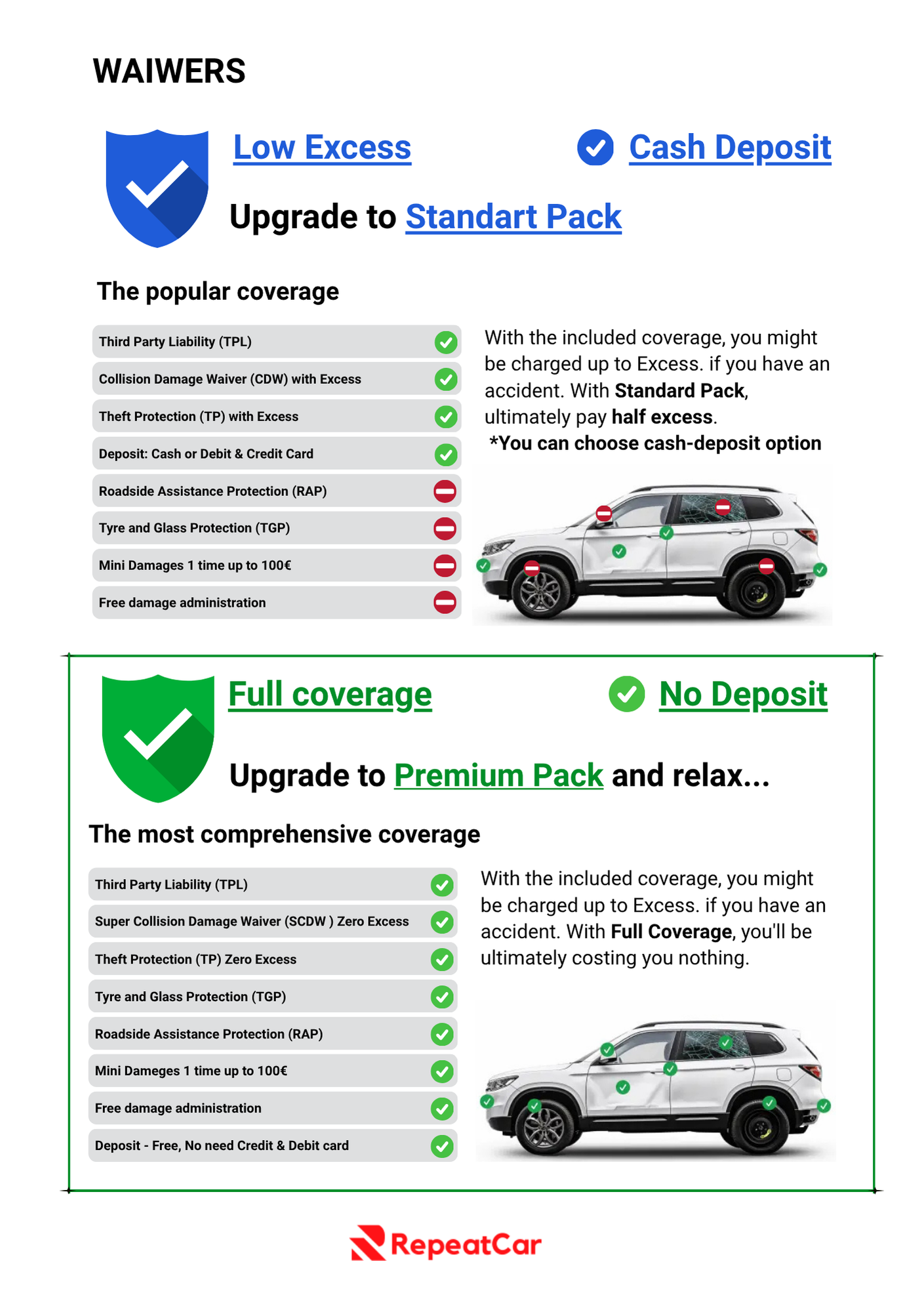 The company logo or website content appearing on another car rental website, or any content uploaded by third parties, visitors, or users, does not impose any liability on RepeatCar. Users agree that neither RepeatCar nor its affiliated companies, employees, managers, or content creators bear any legal or criminal responsibility.